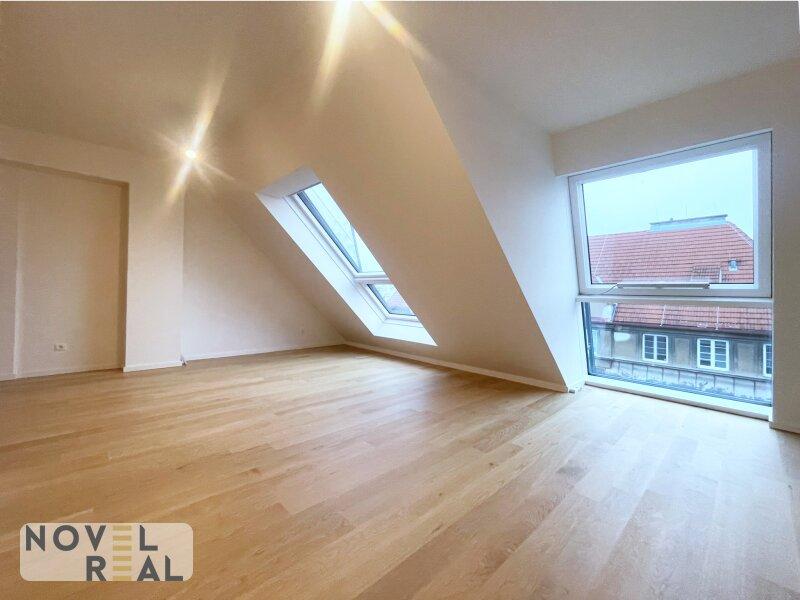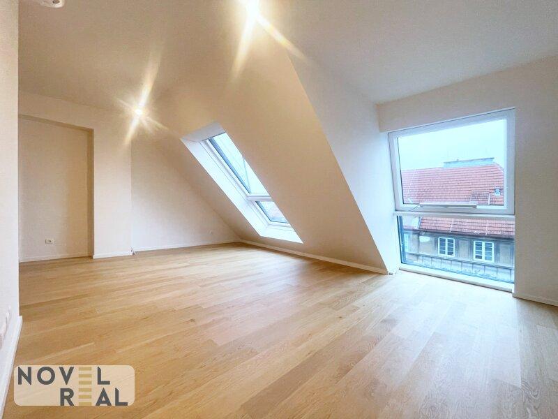 Das obere Dachgeschoss bildet das zentrale Wohnniveau der Maisonette. Der offen gestaltete Wohn-, Ess- und Kochbereich überzeugt durch seine großzügige Raumwirkung und lichtdurchflutete Atmosphäre. Großflächige Dachflächenfenster maximieren den Tageslichteinfall und betonen die architektonische Weite. Die Wohnzone bietet Platz für eine komfortable Sitzlandschaft sowie einen repräsentativen Essbereich. Die offen integrierte Küche schafft einen kommunikativen Mittelpunkt