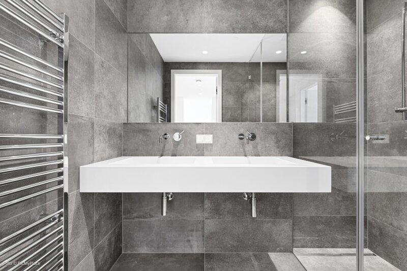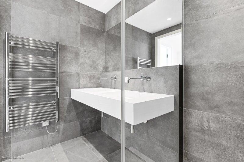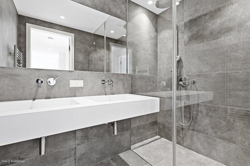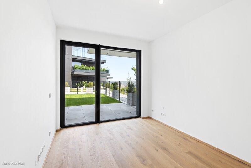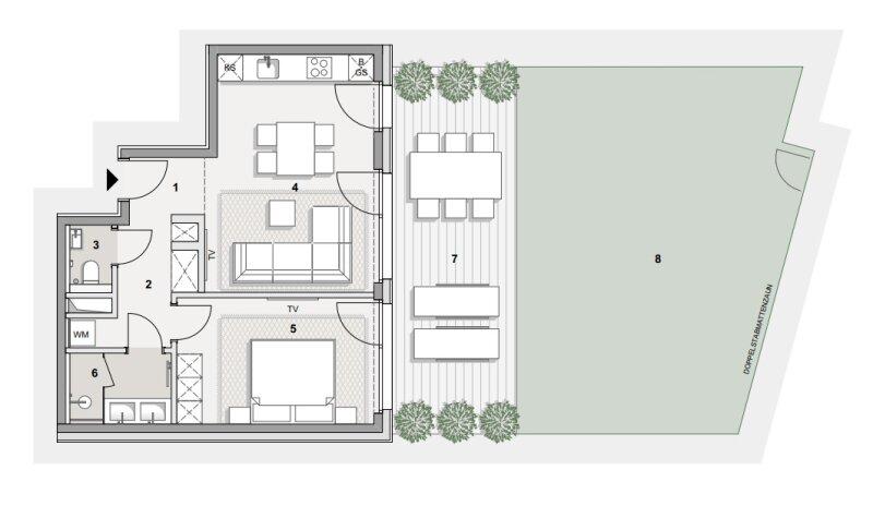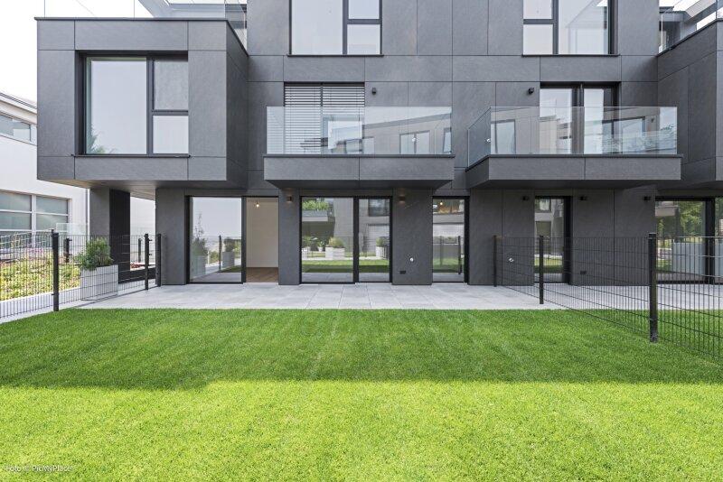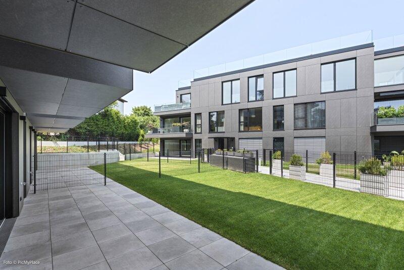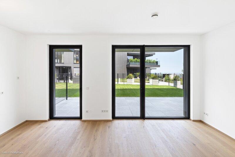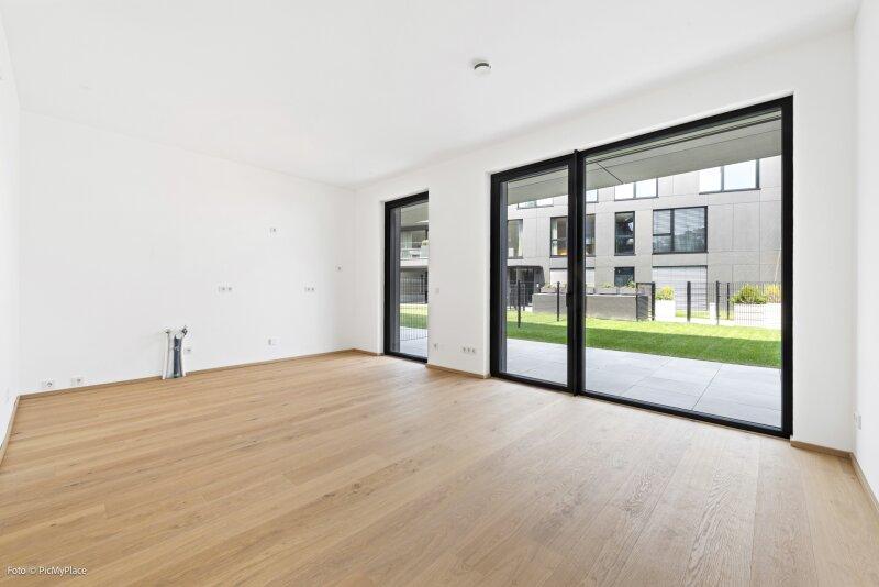 Sie betreten die Wohnung und gelangen in den Eingangsbereich, welcher Sie direkt in den hellen Wohnraum und die offene Küche führt. Von hier aus gelangen Sie auf die ca. 27 m2 große Terrasse und den eigenen ca. 56 m² großen Garten, welcher Ihnen die Möglichkeit zum Entspannen bietet. Über den Flur gelangen Sie rechterhand zu den weiteren Räumlichkeiten der Wohnung. Das Schlafzimmer ist äußerst geräumig und aufgrund der großen Terrassentüren überaus hell. Direkt daneben befindet sich das Badezimmer, welches mit zwei Waschbecken und einer großen begehbaren Dusche ausgestattet ist. Das separate WC ist direkt neben der Eingangstüre.