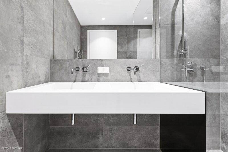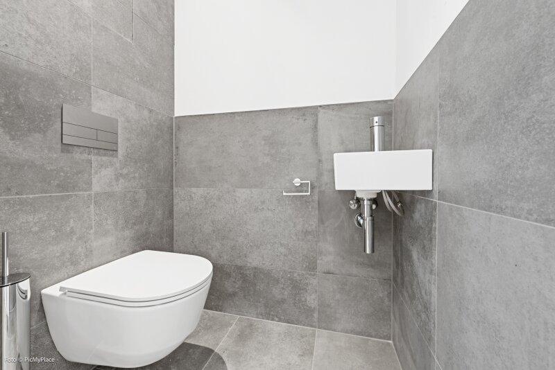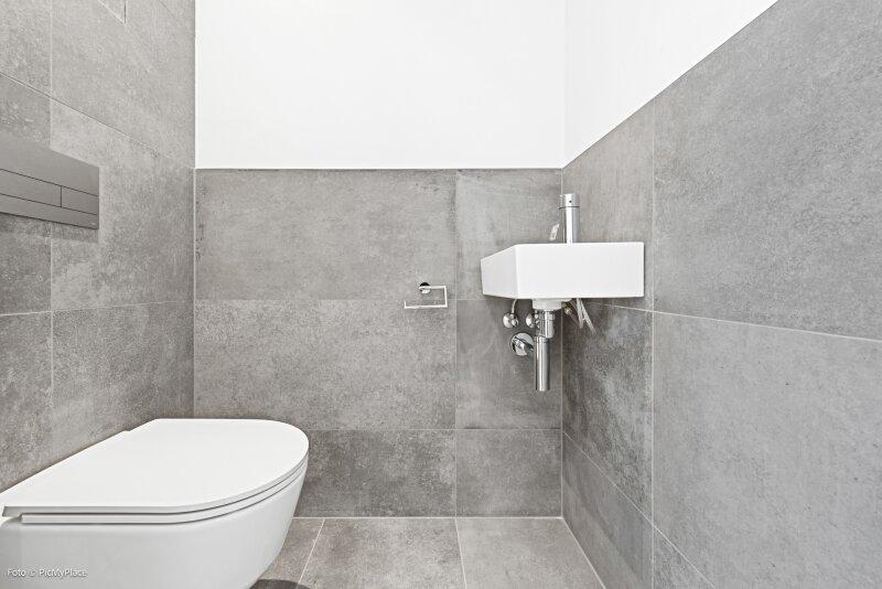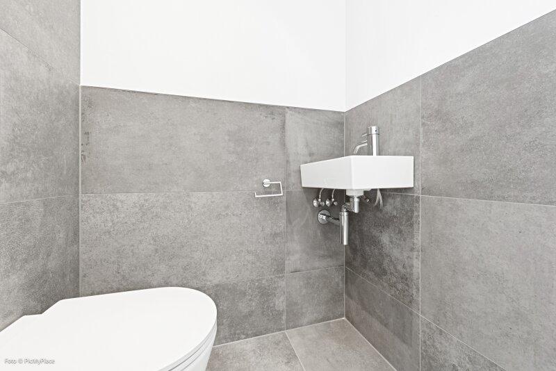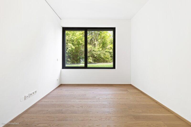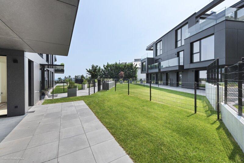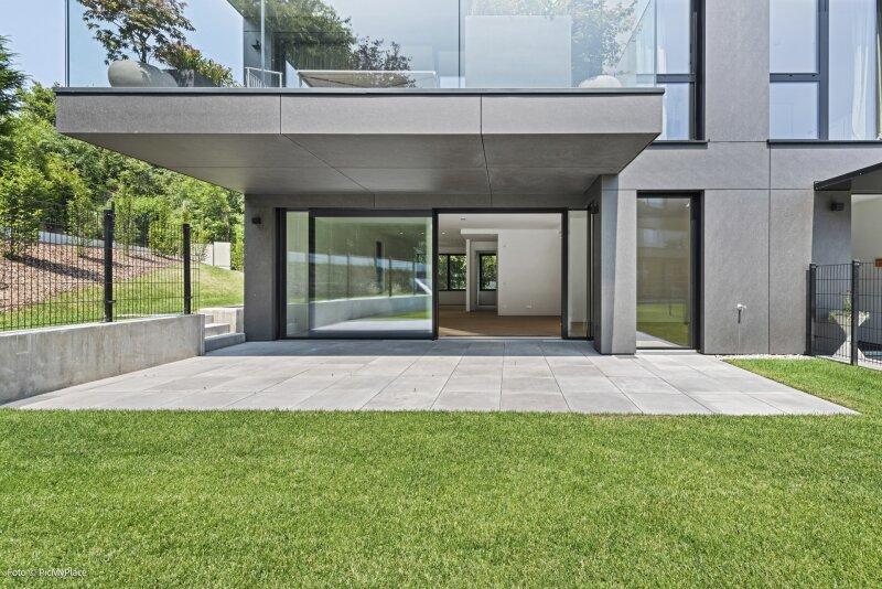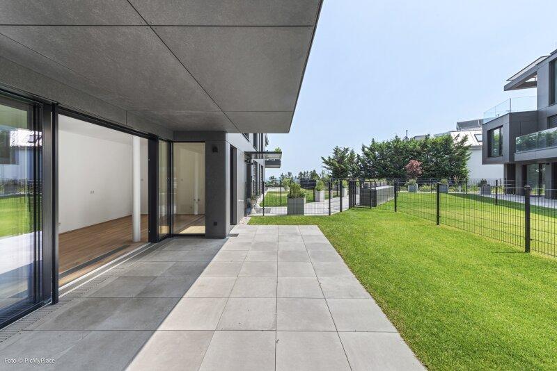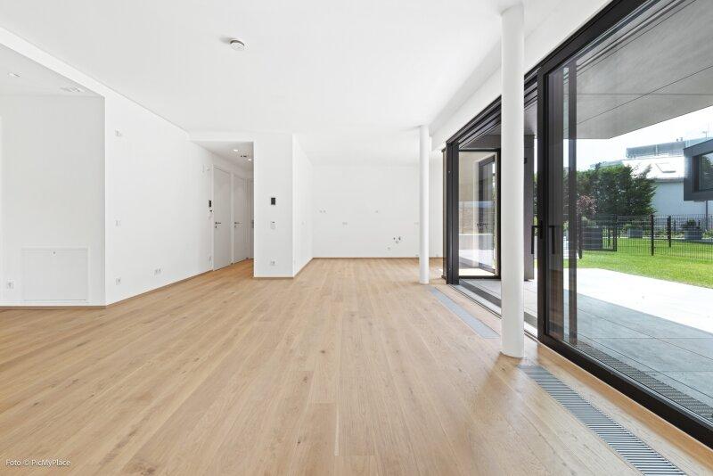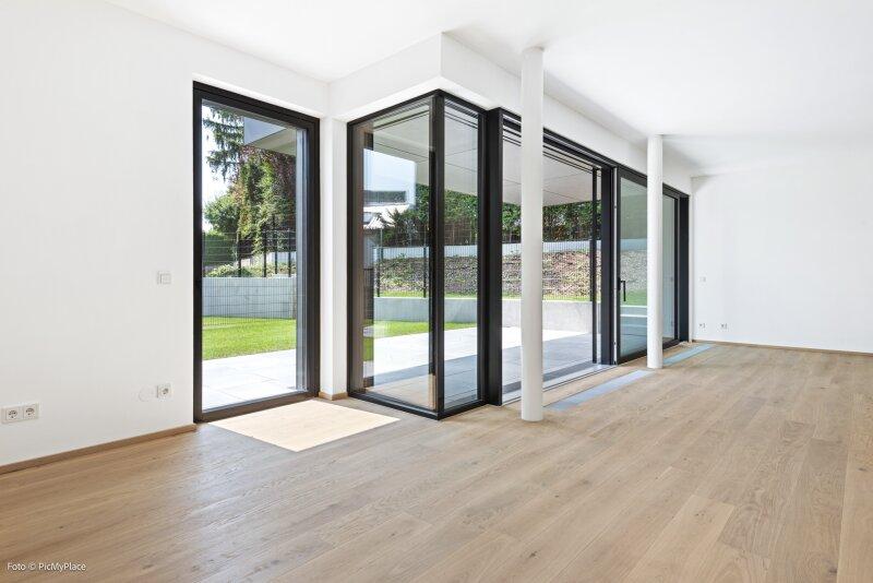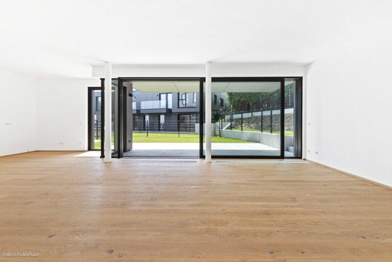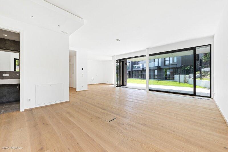 Sie betreten die Wohnung und gelangen in den Eingangsbereich. Dieser bietet dank einer praktischen Nische genügend Platz für jegliche Garderobe. Weiter führt Sie der Eingangsbereich direkt in den hellen und offenen ca. 62 m2 großen Wohnraum. Eine geschickte Raumtrennung schafft es den Raum in mehrere Bereiche zu gliedern. Hier haben Sie ausreichend Platz und Freiraum ihn nach Ihren Wünschen frei zu gestalten. Von Wohnbereich aus gelangen Sie auf die knapp 26 m2 große Terrasse und den eigenen Garten, welcher Ihnen die Möglichkeit zum Entspannen bietet. Über den Flur gelangen Sie rechterhand zu den weiteren Räumlichkeiten der Wohnung. Das Zimmer ist äußerst geräumig und aufgrund der großen Terrassentüren überaus hell. Direkt daneben befindet sich das Badezimmer, welches mit zwei Waschbecken und einer großen begehbaren Dusche ausgestattet ist. Das separate WC und der Abstellraum befinden sich direkt neben der Eingangstüre.