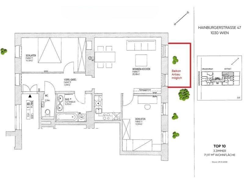 TOP 10 im 1. Liftstock verfügt über 3-Zimmer mit ca. 71 qm Wohnfläche und liegt im Hoftrakt in vollkommener Innenhof-Ruhelage, von grünem Baumbestand umgeben: