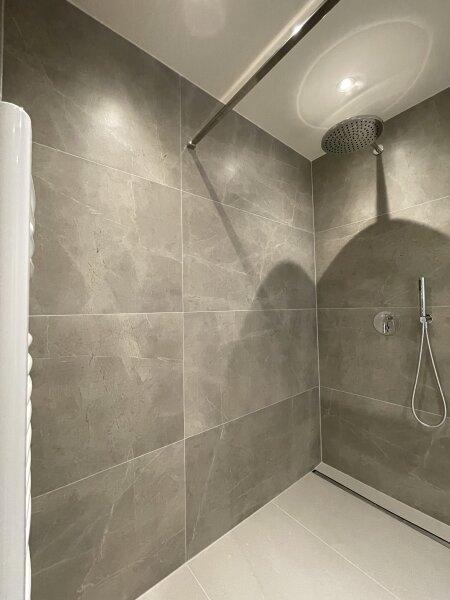 - das großzügige Badezimmer mit Doppelwaschbecken, bodenebener Dusche und Handtuchheizkörper
