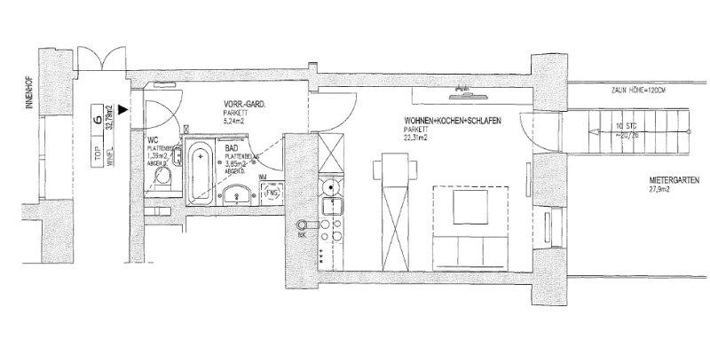 TOP 6 im Hochparterre verfügt über ein Zimmer und eine Wohnfläche im Ausmaß von ca. 33 qm. Die charmante Gartenwohnung ist mit folgenden Räumlichkeiten ausgestattet: