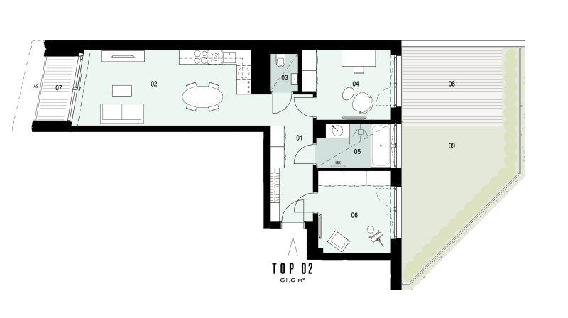 Die luxuriös ausgestaltete 3-Zimmer-Einheit im ersten Liftstock verfügt über eine Wohnfläche von ca. 62 qm sowie eine straßenseitige Loggia und einen Terrassen-/Gartenbereich im Innenhof. Über den Vorraum sind alle Zimmer zentral begehbar: die Wohnküche inklusive vollausgestatteter Designerküche sowie gemütlicher Couchecke mit TV-Gerät, zwei hofseitige Schlafzimmer mit Boxspringbett und Zugang zur Terrasse, ein traumhaftes Badezimmer mit Fenster (Walk-In-Dusche, Badewanne, Waschtisch, Handtuchheizkörper) sowie die separate Toilette mit Handwaschbecken. Bei der Auswahl der Einrichtung wurde auf höchste Qualität und außergewöhnliches Interiordesign wertgelegt. Das Apartment ist in den Innenhof sowie auf die Werdertorgasse ausgerichtet.