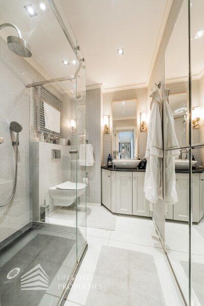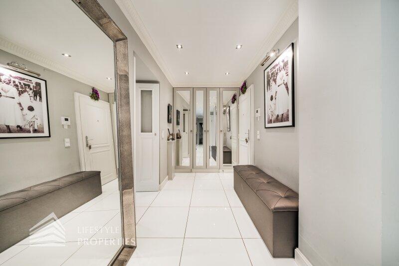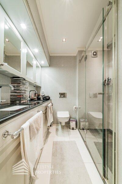 Diese luxuriöse Immobilie befindet sich im 3. Liftstock eines im Jahre 1961 erbauten Neubaus und erstreckt sich über eine Wohnfläche von 126,11 m². Sie teilt sich auf in einen Vorraum, ein Wohnzimmer, eine Küche, drei Schlafzimmer, zwei Bäder, ein Gäste-WC sowie zwei Abstellräume/begehbare Kleiderschränke. Das Besondere an dieser außergewöhnlichen Wohnung ist der großzügige, ruhige Innenhof. Die Wohnräume sind mit weißen Fenstern sowie edlen Glasfliesen ausgestattet. Die Nassräume sind mit hochwertiger Sanitäreinrichtung und Armaturen versehen. Diese einzigartige Immobilie glänzt vor allem durch die Auswahl und Zusammenstellung der hochwertigsten Materialien. Die Wohnung ist außerdem mit hochwertigem Mobiliar ausgestattet, welches im Kaufpreis bereits inbegriffen ist. Zusätzlich stehen zwei Parkplätze im Innenhof zur Verfügung. Diese werden nach dem First Come-First Served Prinzip vergeben. Auch ein Kellerabteil ist dem Objekt zugeordnet. Es besteht zudem die Möglichkeit einer Miet-Kauf-Option.