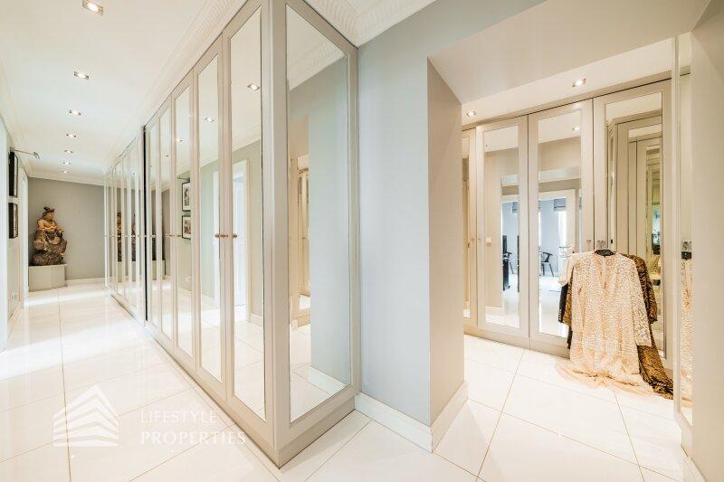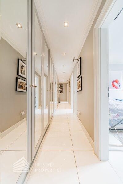 Sie betreten die Wohnung und befinden sich im geräumigen Vorraum, von welchem aus Sie alle Räumlichkeiten der Immmobilie zentral erreichen. Rechterhand befindet sich die luxuriöse Küche. Diese ist mit hochwertigen Geräten der Firma Gaggenau ausgestattet und bietet viel Stauraum. Direkt nebenan liegt das helle Wohn- und Esszimmer. Dieser Bereich besticht durch das modern eingerichtete Mobiliar sowie den großzügigen Platz zum Wohnen und Essen. Ein elektrischer Kamin sorgt für ein ganz besonderes Flair. Die großen Fenster durchfluten den Raum zudem mit viel Licht. Entlang des Flurs finden Sie insgesamt drei Schlafzimmer sowie zwei Bäder vor, welche zentral begehbar sind. Alle Schlafzimmer sind mit hochwertigen Betten ausgestattet und sind sehr hell und einladend gestaltet. Das größte der Schlafzimmer verfügt außerdem über einen begehbaren Kleiderschrank. Die modernen Bäder sind jeweils mit einem Handwaschbecken, einer Dusche sowie einer Toilette ausgestattet. Ihren Gästen steht eine eigene Toilette zur Verfügung. Beheizt wird die Wohnung mittels Fußbodenheizung. Zudem wird die Immobilie in den Sommermonaten durch eine Klimaanlage gekühlt. Im Anhang finden Sie zudem weitere Pläne, die Varianten der Immobilie darstellen und zeigen, wie die Immobilie noch gestaltet werden könnte.