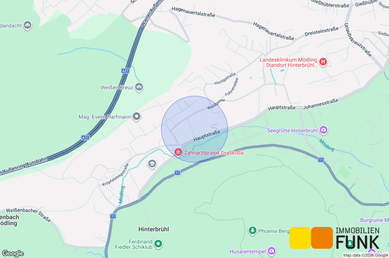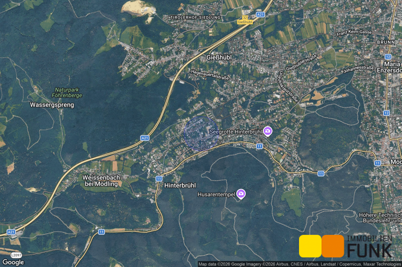 Trotz des Bevölkerungszuwachses der letzten Jahre hat es Hinterbrühl, die beschauliche Marktgemeinde im Süden Wiens, eingebettet im Wienerwald -so die Homepage der Marktgemeinde- immer geschafft, eine Wohngemeinde zu bleiben. Die Seegrotte Hinterbrühl mit dem größten unterirdischen See Europas und die Höldrichsmühle, wo Franz Schubert gerne verweilte, sind die touristischen Höhepunkte des Ortes. Eine Vielzahl an Wanderwegen führen unweit von der Immobilie durch die umliegenden Wälder. Der Kindergarten Hinterbrühl 1 ist in ein paar Minuten zu Fuß erreicht. Der SPAR Supermarkt an der Hauptstraße 57 ist nur ca. 400 m entfernt, die Apotheke "Zur heiligen Dreifaltigkeit" liegt noch näher. Arztpraxen stehen in Hinterbrühl und Gießhübl zur Verfügung. Die Autobuslinie 264 verbindet die Hinterbrühl mit Mödling, die Fahrzeit zum Bahnhof Mödling beträgt weniger als 15 Minuten. Mit dem Auto erreichen Sie die Anschlussstelle "Gießhübl" der A21 in etwa 5 Minuten Fahrzeit (ca. 3 km). So gelangen Sie in nur 17 Fahrminuten in die Shopping City Süd und in etwa 30 Minuten zum Flughafen Wien-Schwechat .