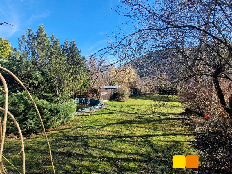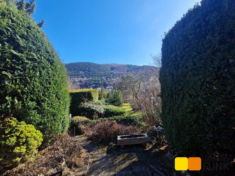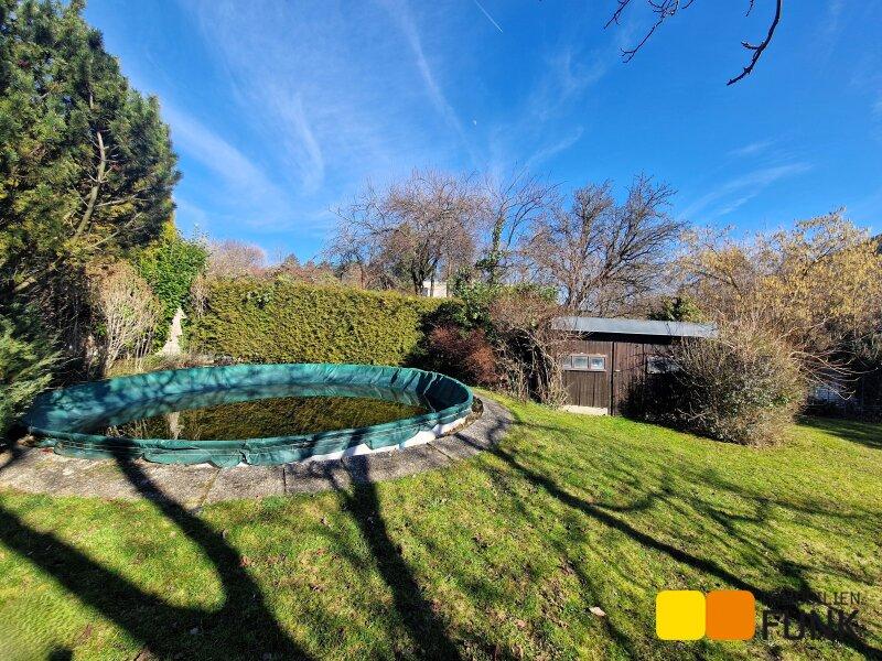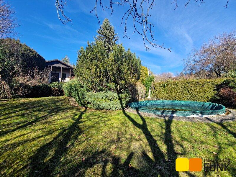 Das 1.400 m² große Grundstück besteht aus dem bereits beschriebenen Vorgarten und einem großen, nach Süden ausgerichteten, sonnigen Garten. Hier steht auch ein Holznebengebäude, in dem die Pooltechnik und die Gartengeräte untergebracht sind.