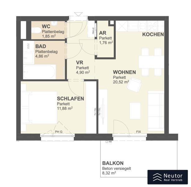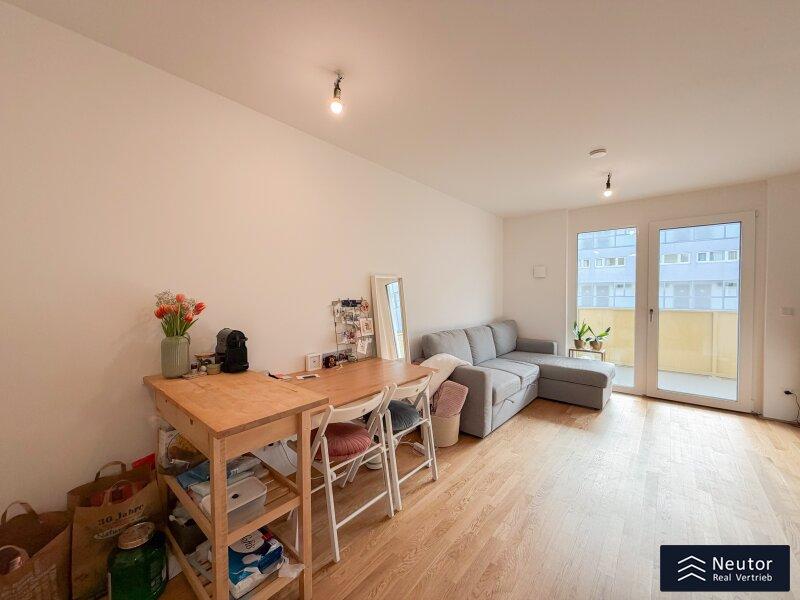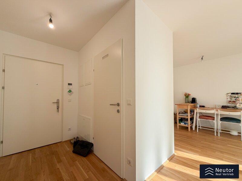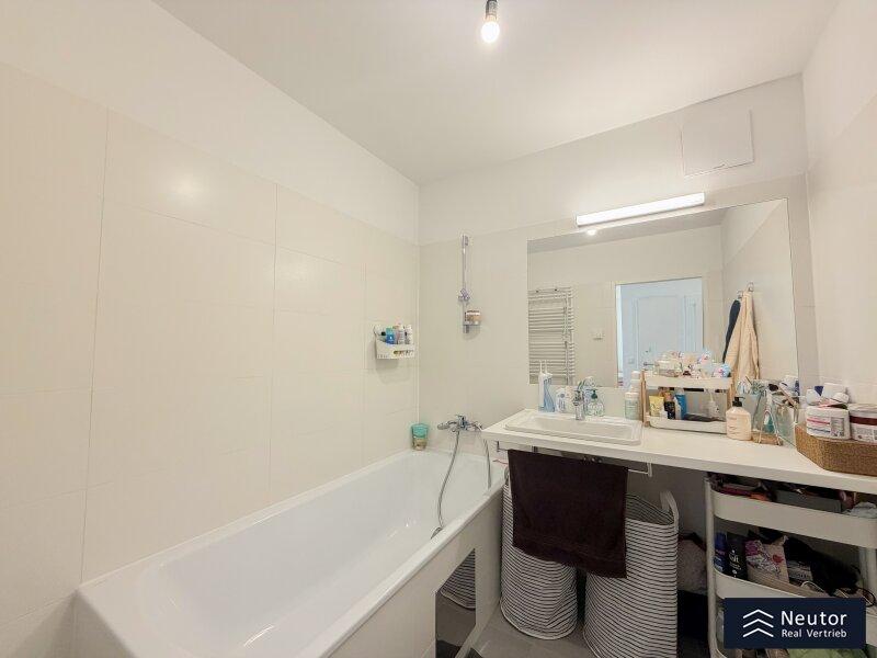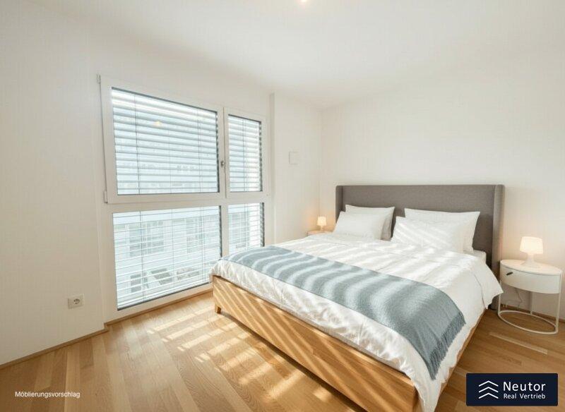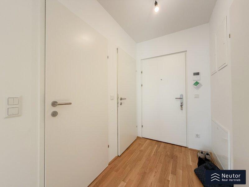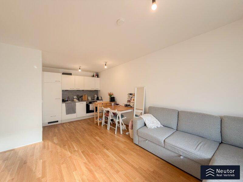 Diese moderne Neubauwohnung im vierten Stock überzeugt durch eine durchdachte Raumaufteilung sowie ein helles und freundliches Wohnambiente. Der funktional gestaltete Vorraum bietet einen einladenden Eingangsbereich und ermöglicht den Zugang zu allen Räumen der Wohnung. Für zusätzlichen Komfort steht ein separat angelegtes WC mit Handwaschbecken zur Verfügung. Das stilvolle Badezimmer ist mit einer Badewanne sowie einem Waschmaschinenanschluss ausgestattet und erfüllt damit alle Anforderungen des modernen Wohnens. Ein praktischer Abstellraum sorgt für wertvollen zusätzlichen Stauraum und trägt zu einem aufgeräumten Wohngefühl bei. Das Schlafzimmer präsentiert sich hell und bietet ausreichend Platz für Erholung und Rückzug. Das großzügige, lichtdurchflutete Wohnzimmer bildet das Herzstück der Wohnung und ist mit einer modernen Einbauküche ausgestattet. Hochwertige Geräte und ein zeitloses Design unterstreichen die Qualität dieses Wohnbereichs. Der Balkon erweitert den Wohnraum ins Freie und lädt zum Entspannen und Verweilen ein.Zur Wohnung gehört ein eigenes Kellerabteil, dass zusätzlichen Stauraum bietet. Für Fahrräder stehen mehrere gemeinschaftlich nutzbare Fahrradräume zur Verfügung. Familienfreundlichkeit wird in dieser Wohnanlage großgeschrieben: Ein Kinderspielplatz auf dem Grundstück sorgt für Spielmöglichkeiten direkt vor der Tür. Optional kann eine Garage angemietet werden, die eine sichere und bequeme Parkmöglichkeit bietet. Insgesamt vereint diese Wohnung hohen Wohnkomfort mit praktischer Ausstattung in zentraler und dennoch ruhiger Lage. Ein ideales Zuhause für alle, die Wert auf Lebensqualität und Funktionalität legen.