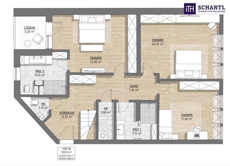 Der Zugang zur Wohnung erfolgt im ersten Dachgeschoss über einen rund 12 Quadratmeter großen Vorraum, von dem aus alle Räume dieser Ebene zentral erschlossen werden. Hier befinden sich drei Schlafzimmer mit Größen von etwa 17, 25 und 22 Quadratmetern. Das Masterbedroom verfügt über ein eigenes En-Suite-Badezimmer sowie eine rund 5 Quadratmeter große, in den Innenhof ausgerichtete Loggia, die einen ruhigen privaten Rückzugsort schafft. Ergänzend stehen ein weiteres Badezimmer sowie ein praktischer Abstellraum unter der Treppe mit Waschmaschinenanschluss zur Verfügung.