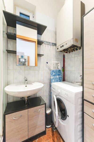 - Badezimmer mit Dusche, Waschbecken und Waschmaschinenanschluss