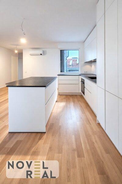 Die offene Wohnküche ist designorientiert gestaltet und lädt zum Wohlfühlen ein, ideal für gesellige Abende oder entspannte Stunden. Ein direkter Zugang führt hinaus auf die große Terrasse, die einen beeindruckenden Blick über Wien eröffnet und als exklusiver Rückzugsort mitten in der Stadt dient.