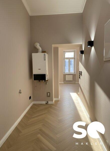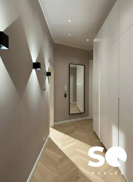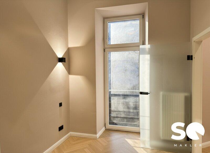Die Wohnung wurde soeben generalsaniert und wird als hochwertiger Erstbezug angeboten. Historische Elemente wie Stuckatur treffen hier auf ein modernes Beleuchtungskonzept mit stilvollen Wandleuchten, edle Materialien und zeitloses Design.