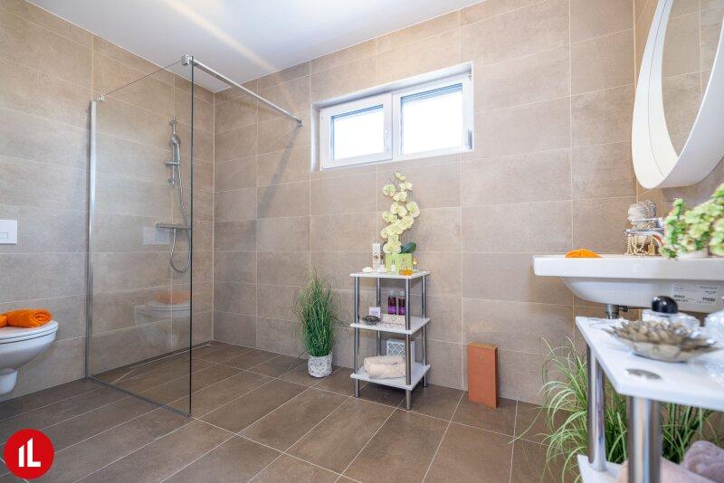 * Lichtdurchflutetes Badezimmer: großzügige Walk-In-Dusche, Handwaschbecken und WC