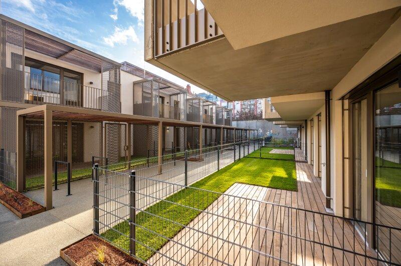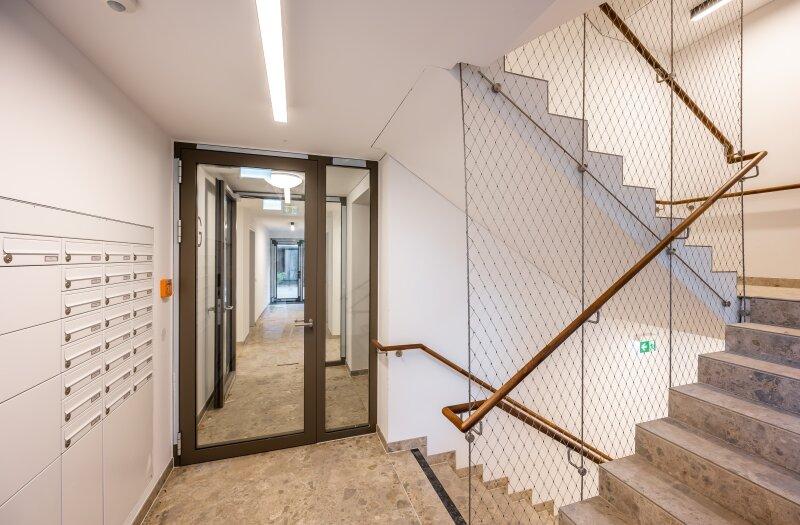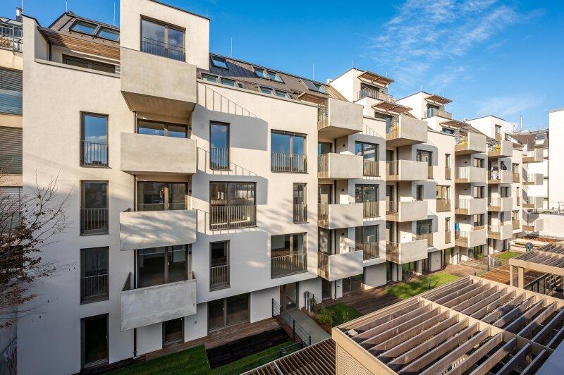 Das Haus selbst verfügt neben Waschküche, Fahrradabstellraum, großzügigen Fahrrardstehern im Freien, Kinderwagenraum, Postboxen und nachhaltigen Grünanlagengestaltungkonzept auch über eine eigene Laufbahn/Gemeinschaftsterrasse am Dach des Hofgebäudes. Darüber hinaus stehen in der hauseigenen Tiefgarage PKW als auch Motorradstellplätze zur Verfügung (gegen Aufpreis).