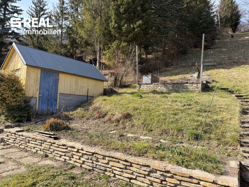 Vor und hinter dem Haus befinden sich ebene Terrassenflächen. Der weitere Garten ist terrassenförmig angelegt und durch einen Zaun vom anschließenden landwirtschaftlichen Grundstück getrennt.