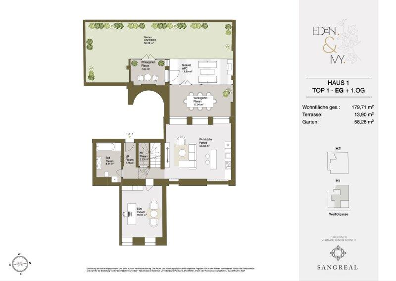 Die Wohnung erstreckt sich über zwei Etagen und verfügt neben einer Gartenfläche von ca. 58m² über eine bezaubernde, westlich ausgerichtete Balkonfläche von ca. 15m². Eine elegante Treppe im Eingangsbereich bietet besonders viel Komfort und verbindet die beiden Etagen miteinander. Das Herzstück dieser Wohnung ist der Wohnbereich mit angrenzendem Wintergarten mit einer beachtlichen Fläche von insgesamt ca. 54m².