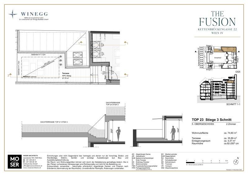 Der klimatisierte 2-Zimmer-Erstbezug befindet sich im 1. Dachgeschoß (entspricht dem 5. Obergeschoß) und verfügt über ca. 77 qm Wohnfläche sowie zwei Terrassen im Gesamtausmaß von ca. 40 qm.