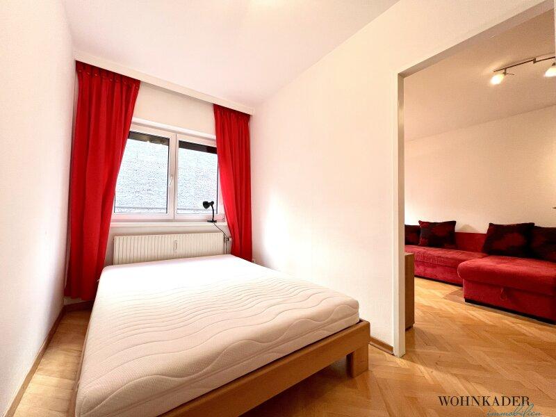 Ein separates Schlafzimmer bzw. Kabinett kann mittels Schiebetür flexibel vom Wohnbereich abgetrennt werden. Dadurch eignet sich der Raum sowohl als klassisches Schlafzimmer als auch hervorragend als Homeoffice oder Gästezimmer.