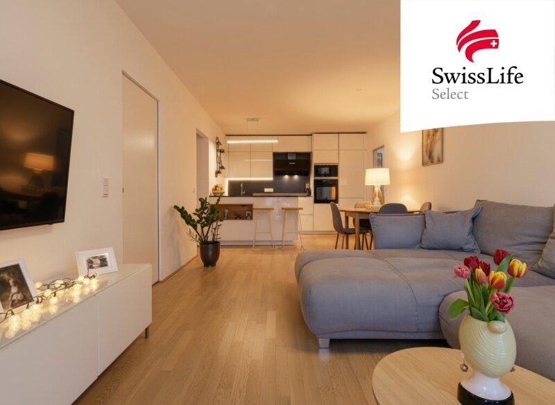 Der offene Wohnbereich strahlt mit hellem Parkettboden, bodentiefen Fenstern mit Vorbereitung für elektrische Rollläden und einer modernen, grifflosen Küche Markenküche mit Kochinsel und hochwertigen Elektrogeräten pure Wohnfreude aus - genug Platz für Esstisch und Couch, und vom Wohnbereich geht´s direkt auf den rund 8,33 m² großen Balkon, der im Sommer zum entspannten zweiten Wohnzimmer unter freiem Himmel wird.