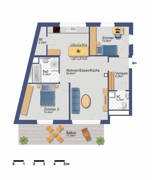 Die Wohnung liegt im 1. Obergeschoß mit Lift und verfügt über eine Wohnfläche von ca. 81 m² sowie einen großzügigen, westseitig ausgerichteten Balkon mit ca. 17 m², der zum Entspannen in der Nachmittagssonne einlädt.