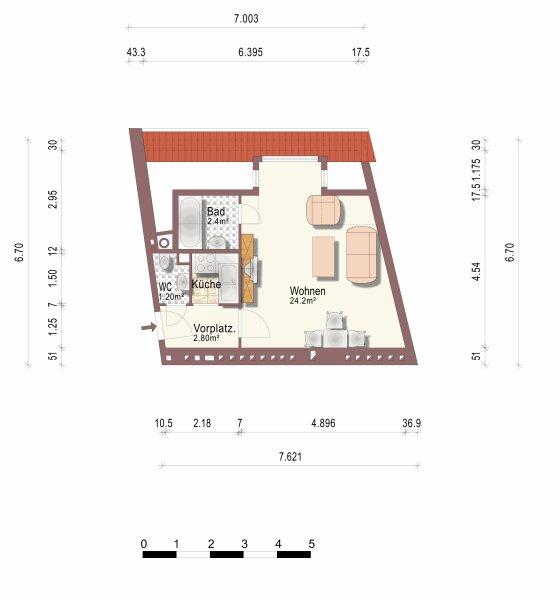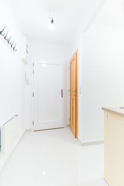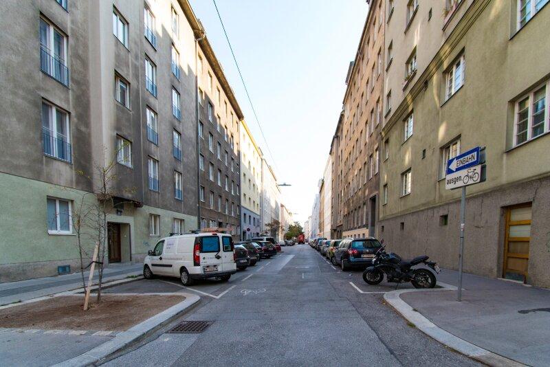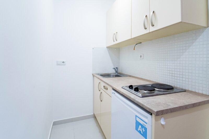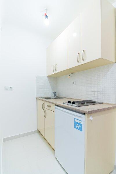 Die Wohnung ist nordwestseitig ausgerichtet und blickt auf den ruhigen Innenhof. Vom Vorraum sind das separate WC, die Küche sowie der Wohn-/Schlafraum zugänglich. Die Küche ist klein, jedoch funktional ausgestattet (Spüle, 2-Zonen-Herd, Kühlschrank). Das Badezimmer mit Dusche und Waschmaschinenanschluss ist direkt vom Wohnraum begehbar. Die Beheizung sowie die Warmwasseraufbereitung der Wohnung erfolgen mittels Gasetagenheizung.