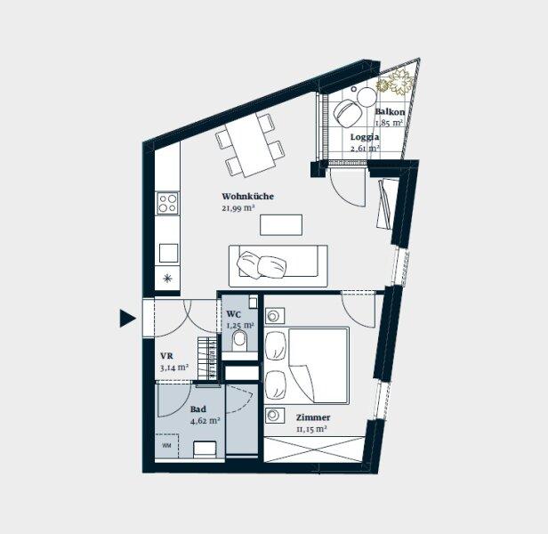 Zur Vermietung gelangt diese sonnige 2-Zimmer-Wohnung mit Loggia im 12. Wiener Gemeindebezirk Meidling.