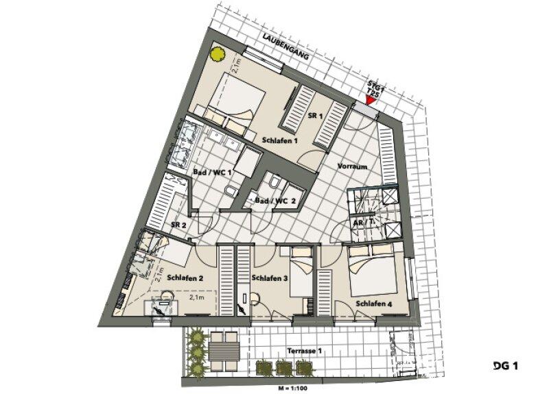 Top 25 in Stiege 1 präsentiert sich als großzügige Dachgeschoss-Maisonette über zwei Ebenen und verbindet eine klare Grundrissstruktur mit weitläufigen Freiflächen und hochwertiger Ausstattung.