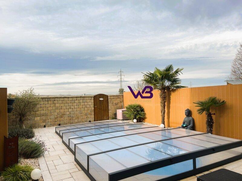 Der traumhafte Garten lässt keine Wünsche offen. Salzwasser-Pool (5,5 x 3 m) mit Überdachung, LED-Beleuchtung, Zeitschaltuhr & Luftwärmepumpe, Terrasse mit Platz für Lounge- oder Essbereich Exquisiter Sommer-/Wintergarten, vollständig verglast und mit integrierter Küche, Grillplatz und viel Stauraum für Gartenzubehör - nutzbar zu jeder Jahreszeit.