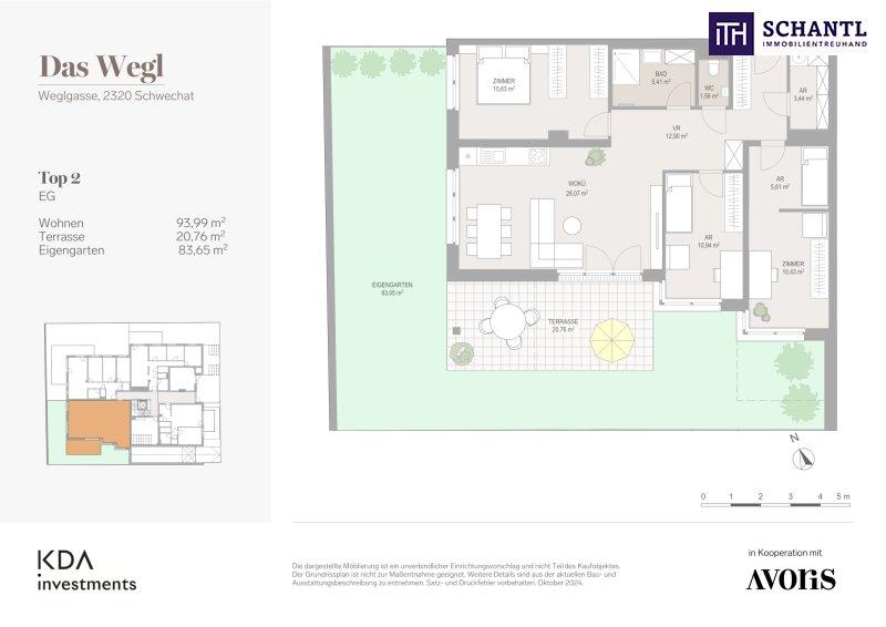 Wohnfläche: ca. 93,99 m² + Terrasse: ca. 20,76 m² + Garten: ca. 83,65 m² + Kellerabteil: ca. 2,55 m²