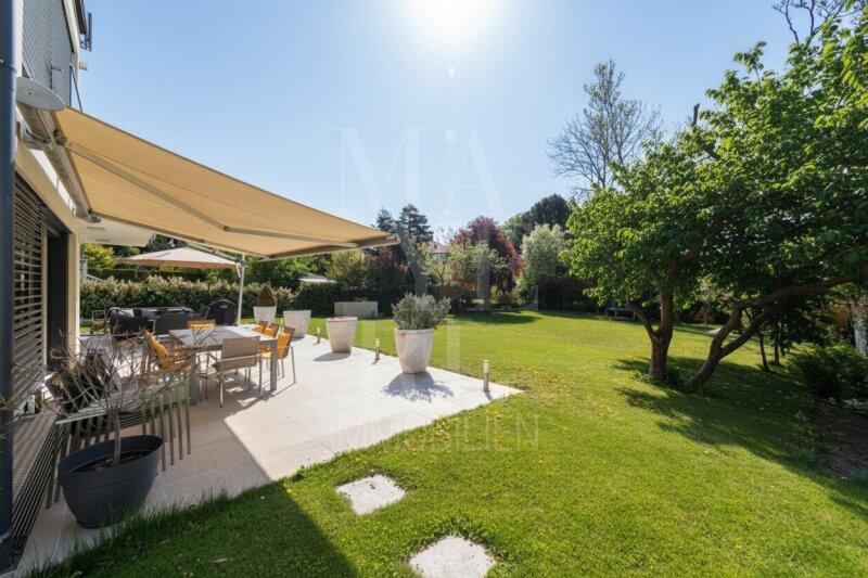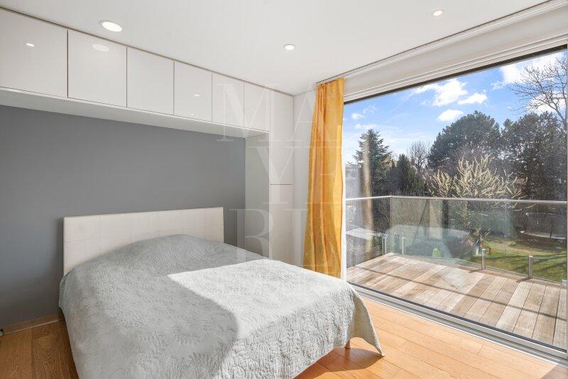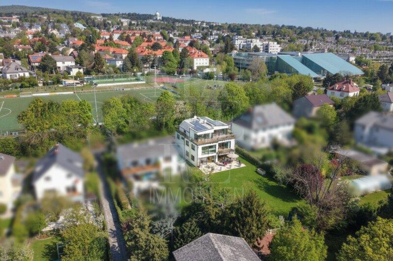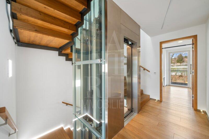 Die 2016 von Venture Property Holding GmbH fertiggestellte, unterkellerte Villa vereint moderne Architektur mit luxuriöser Ausstattung und innovativer Gebäudetechnik. Ein Glas-Personenaufzug erschließt alle Ebenen, ein intelligentes BUS-System steuert zentral sämtliche Haustechnikfunktionen.