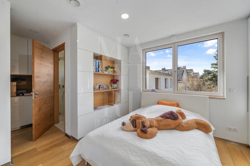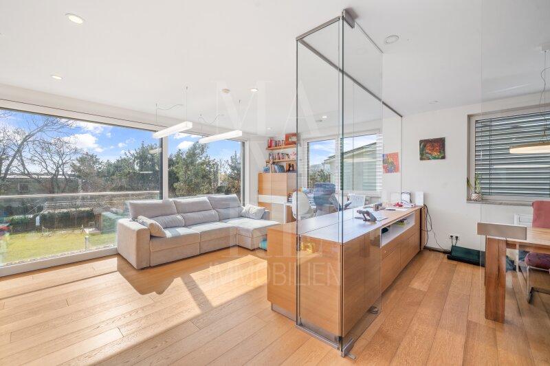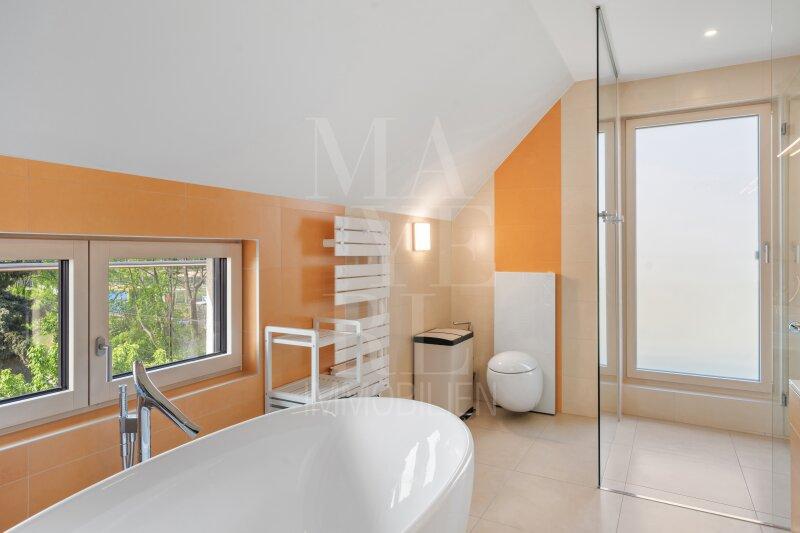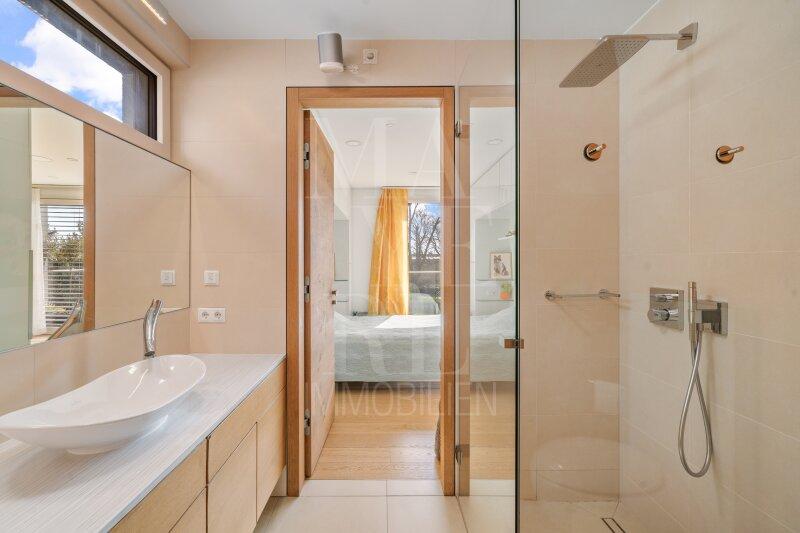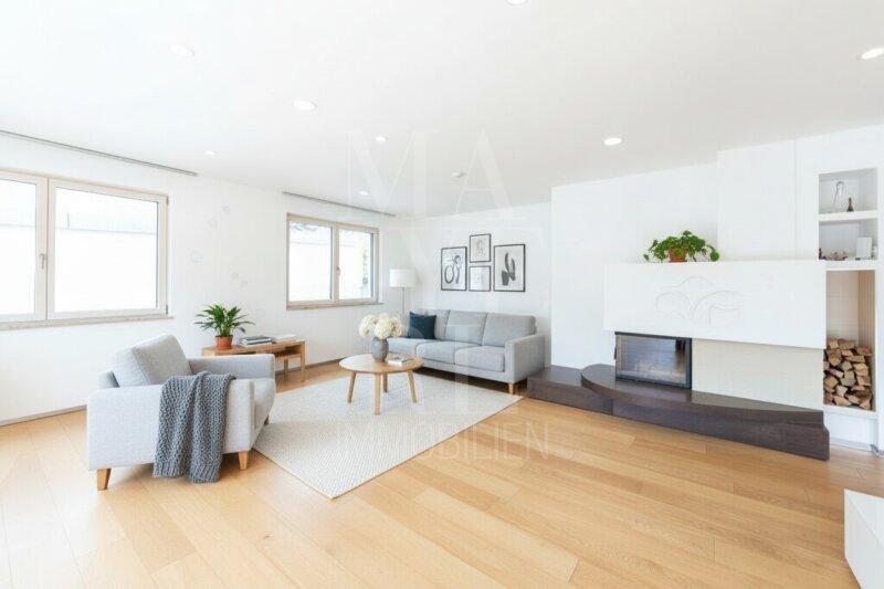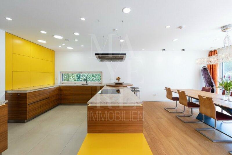 Fußbodenheizung im gesamten Haus, Kaminofen im Wohnbereich sowie maßgefertigte Tischlereinbauten und zwei hochwertig ausgestattete Küchen mit Geräten von Miele unterstreichen den exklusiven Wohnanspruch.
