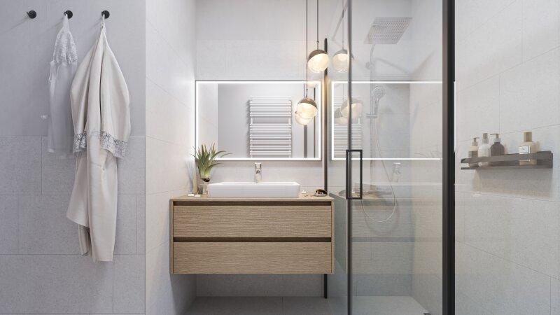 Hochwertig ausgestattete Badezimmer mit Feinsteinzeug