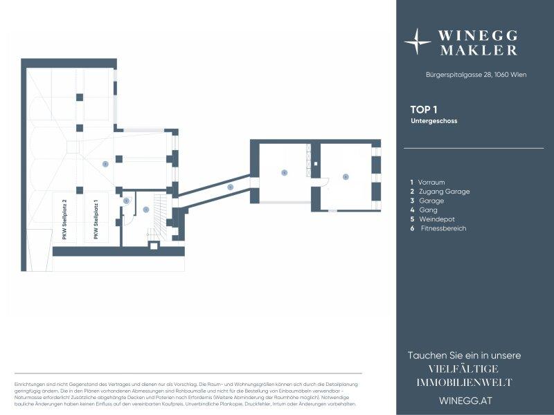 Der 56 m² große Multifunktionsraum mit elektrischem Rolltor und imposanter Doppelflügeltüre aus Eisen eröffnet viele Möglichkeiten offen: Home-Gym für Ihr tägliches Workout, Heimwerkstatt für kreative Projekte oder privates Atelier. Zusätzlich ist der Raum direkt von der Straße aus mit dem Auto anfahrbar ideal zum unkomplizierten Be- und Entladen von Sportgeräten, Werkzeugmaschinen, Kunstmaterialien oder größeren Lieferungen. Der großzügige Weinkeller im Kellergeschoss bietet den perfekten Rahmen für Ihre Sammlung, während zwei Tiefgaragenstellplätze, die aus der Wohnung direkt erreichbar für maximalen Komfort sorgen. Dank der intelligenten Raumaufteilung und großzügigen Fläche ist dieses Objekt der perfekte Ort, um Arbeit und Wohnen zu kombinieren. Ob als Homeoffice, kreatives Atelier oder professionelle Werkstatt, hier finden Sie genug Raum für alle Ihre Bedürfnisse.