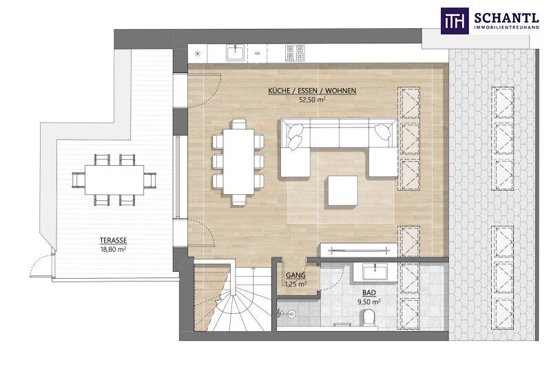 Im zweiten Dachgeschoss befindet sich der großzügige Wohnbereich der Wohnung. Das rund 52 Quadratmeter große Wohn-Esszimmer bietet ein offenes, lichtdurchflutetes Raumgefühl und vielfältige Gestaltungsmöglichkeiten für Wohnen und Essen. Zusätzlich stehen auf dieser Ebene ein Badezimmer mit WC mit knapp 10 Quadratmetern sowie eine rund 19 Quadratmeter große Sonnenterrasse zur Verfügung, die den Wohnraum ideal nach außen erweitert.