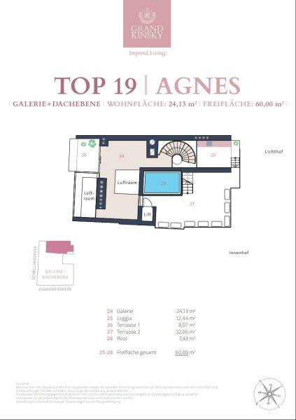 Die Dachebene besteht aus einer einzigartigen Galerie mit weitläufiger Terrasse mit ca. 63 m². Ein privater ca. 7,5 m² großer Nirosta Wateredgepool erwartet Sie auf dieser Ebene, von welcher Sie über die Dächer im Herzen der Wiener Innenstadt blicken. Die Granitblumentröge mit Kirschlorbeer werden automatisch bewässert und ein Sonnensegel spendet generösen Schatten. Auf den Terrassen sind alle Anschlüsse für eine Sommerküche vorhanden.