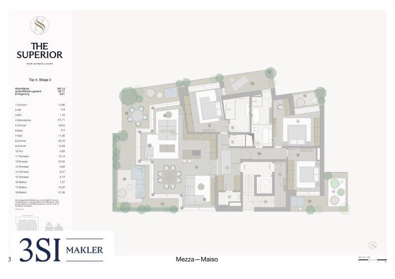 Im Zusammenspiel klarer Linien und präzise gesetzter Details entsteht die architektonische Qualität von THE SUPERIOR. Jede Entscheidung folgt einem übergeordneten Prinzip: Reduktion, Dauerhaftigkeit und Materialität. Die Innenräume überzeugen durch sorgfältig ausgewählte Oberflächen, die Ruhe ausstrahlen und zugleich Tiefe entwickeln. Eichenparkett bringt natürliche Wärme in die Räume, während großformatige Verglasungen Licht und Weitblick selbstverständlich integrieren. Auch in den Bädern setzt sich diese Klarheit fort. Hochwertiges Feinsteinzeug trifft auf fein ausgeführte Sanitärobjekte und schafft eine Atmosphäre, die zurückhaltend und zugleich anspruchsvoll wirkt. Technik versteht sich hier als diskrete Unterstützung. Split-Kühlgeräte sorgen für angenehme Temperaturen, ohne in Erscheinung zu treten. Elektrisch gesteuerte Beschattungselemente regulieren Licht und Atmosphäre im Hintergrund, während die Video-Gegensprechanlage Sicherheit und Privatsphäre gewährleistet.