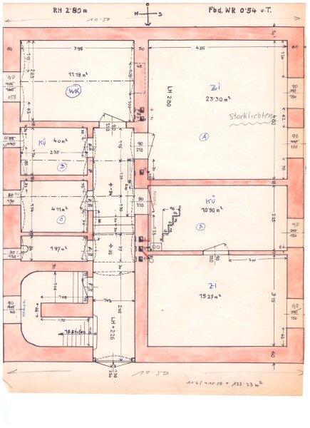 Dort befinden sich im Erdgeschoß neben einem großen Wohnraum zwei weitere Zimmer sowie ein Badezimmer mit Badewanne ebenso wie ein Raum für eine Küche, eine Toilette mit Fenster und zwei Abstellräume.