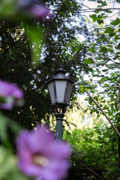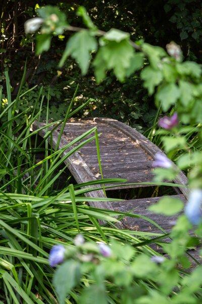Hinter dem Wohnhaus, inmitten des weitläufigen, verträumten Gartens, überrascht ein verwunschenes Plätzchen: Ein kleines Holzhäuschen, eine Laterne, eine kleine Bank umgeben von üppigem Grün lädt es zum Verweilen, Entspannen und Träumen ein.