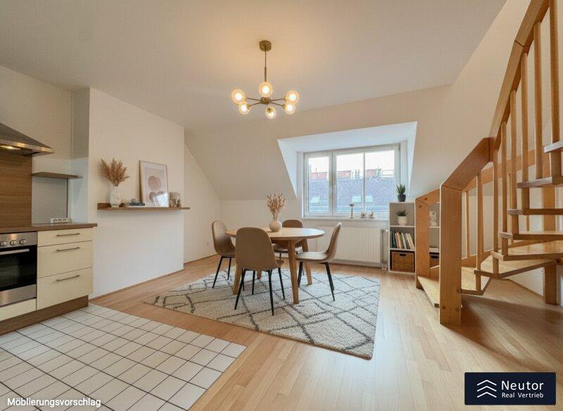 Zur Vermietung gelangt diese charmante Dachgeschoss-Maisonette mit ca. 104 m² Gesamtwohnfläche, die sich großzügig über zwei Ebenen erstreckt. Vier gut geschnittene Zimmer, zwei Terrassen, sowie die zentrale Lage schaffen ein attraktives Wohnangebot mit viel Licht und Freiraum - ideal für alle, die urbanes Wohnen mit Komfort verbinden möchten.