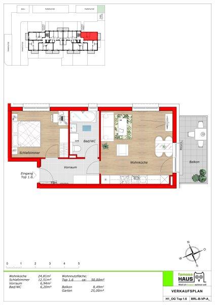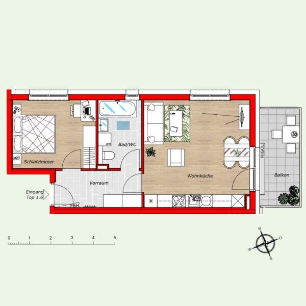Die Wohnung Top 1.6 befindet sich im 1 OG und bietet auf rund 50 m² ein Wohngefühl, das größer wirkt als die Fläche: hell, offen und angenehm durchdacht. Mittelpunkt ist die sonnige Wohnküche mit direktem Zugang auf den großen Balkon (ca. 8,5 m²) der perfekte Platz für Frühstück in der Sonne oder entspannte Abende im Freien. Ein Schlafzimmer, Bad und Vorraum runden den kompakten Grundriss ab.