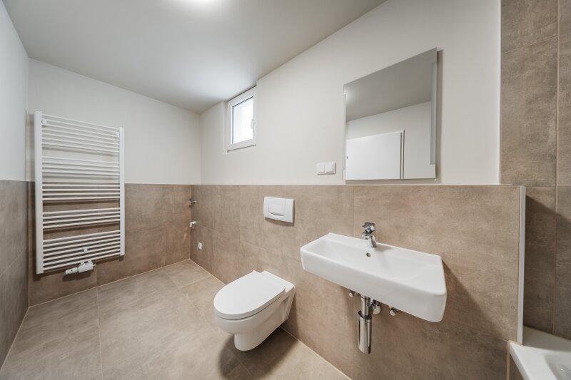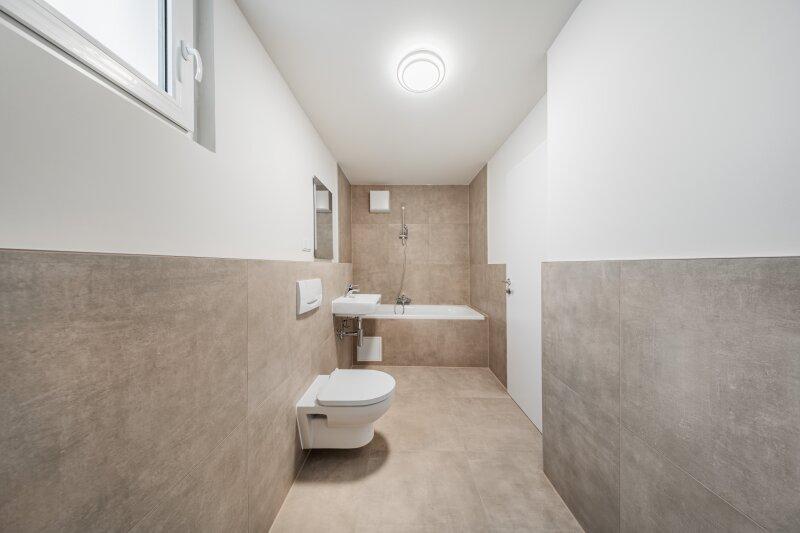 Vom Vorraum aus begeht man das Badezimmer (mit Badewanne und Fenster) und einen Abstellraum. Das Westseitig gelegene Wohnzimmer bietet einen schönen Ausblick und schaut in den Innenhof.
