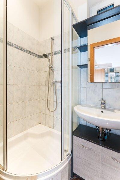 - Badezimmer mit Dusche, Waschbecken und Waschmaschinenanschluss