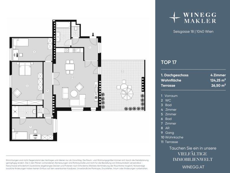 Denn in dieser 124m2 Dachterrassen-Wohnung sind Sie on top. 4-Zimmer Dachgeschoßwohnung vom Feinsten mit über 40m2 zentraler Wohnküche und einer 26m2 Terrasse - klingt bezaubernd, ist es auch. In dieser luxuriösen Wohnung werden Sie und Ihre Liebsten sich ganz und gar wohlfühlen. 3 Schlafzimmer, 2 Badezimmer, der Vorraum und das WC sind für Sie hochwertig und elegant ausgestattet und tragen so zu Ihrem Wohnkomfort bei. Einfach herrlich!