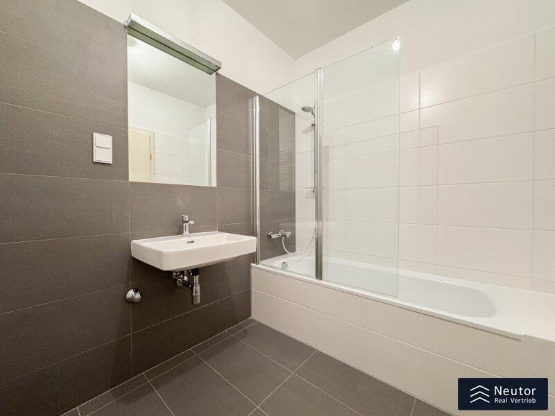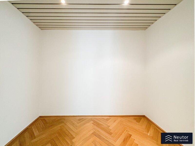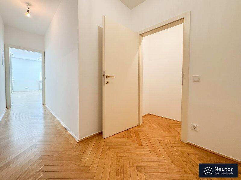 Der einladende Vorraum bietet ausreichend Platz für eine stilvolle Garderobe und erschließt unter anderem einen praktischen Abstellraum. Von hier aus führt der Weg in das moderne Badezimmer, das mit einer Badewanne ausgestattet ist und zu entspannten Momenten einlädt. Das Herzstück der Wohnung bildet der großzügige Wohn- und Essbereich, der dank seiner großen Fensterflächen von viel Tageslicht durchflutet wird und eine helle, freundliche Atmosphäre schafft. Die hochwertige Küche ist durch elegante Glaselement-Türen optisch vom Wohnbereich getrennt und fügt sich harmonisch in das Gesamtbild ein. Das angrenzende Schlafzimmer überzeugt durch seine angenehme Lichtdurchflutung und ein behagliches Raumgefühl. Ein großzügig gestalteter Ankleidebereich ergänzt dieses Ensemble ideal und sorgt für zusätzlichen Komfort. Abgerundet wird das stimmige Gesamtbild durch eine zentrale Klimatisierung, die auch an warmen Sommertagen ein durchgehend angenehmes Raumklima gewährleistet.