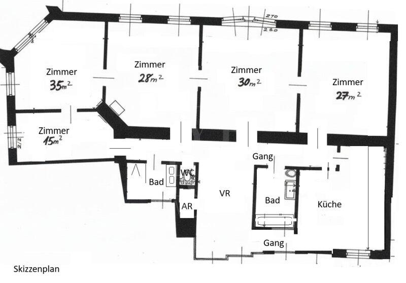 - 3 große Zimmer ( 27m2, 28 m2 und 30 m2), eines davon nicht zentral begehbar!
