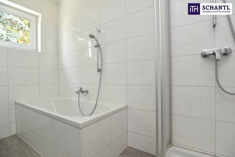 - helles Badezimmer mit Fenster, Dusche, Badewanne & Waschmaschinenanschluss