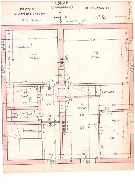 Dort befinden sich im Erdgeschoß neben einem großen Wohnraum zwei weitere Zimmer sowie ein Badezimmer mit Badewanne ebenso wie ein Raum für eine Küche, eine Toilette mit Fenster und zwei Abstellräume.