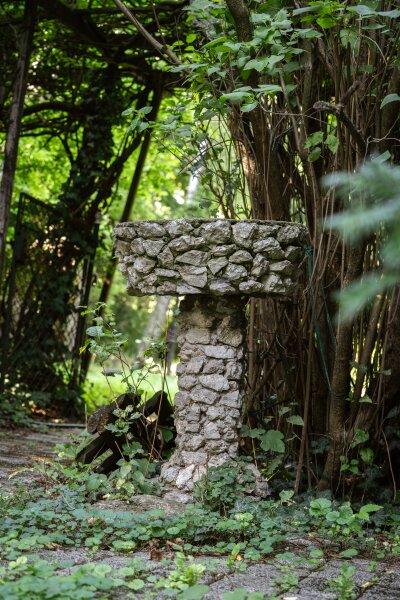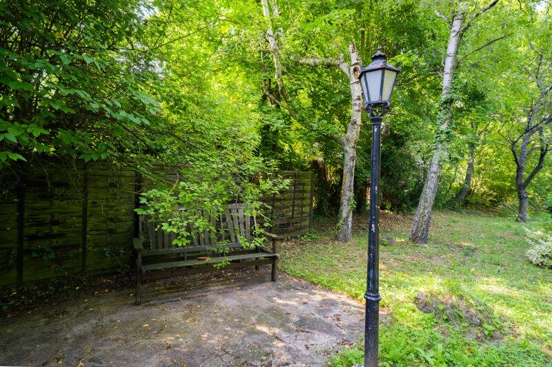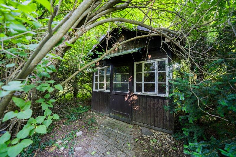 Hinter dem Wohnhaus, inmitten des weitläufigen, verträumten Gartens, überrascht ein verwunschenes Plätzchen: Ein kleines Holzhäuschen, eine Laterne, eine kleine Bank umgeben von üppigem Grün lädt es zum Verweilen, Entspannen und Träumen ein.