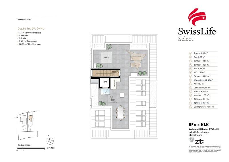 Die Dachterrasse erweitert den Wohnraum ins Freie und schafft einen privaten Rückzugsort über den Dächern des Bezirks.