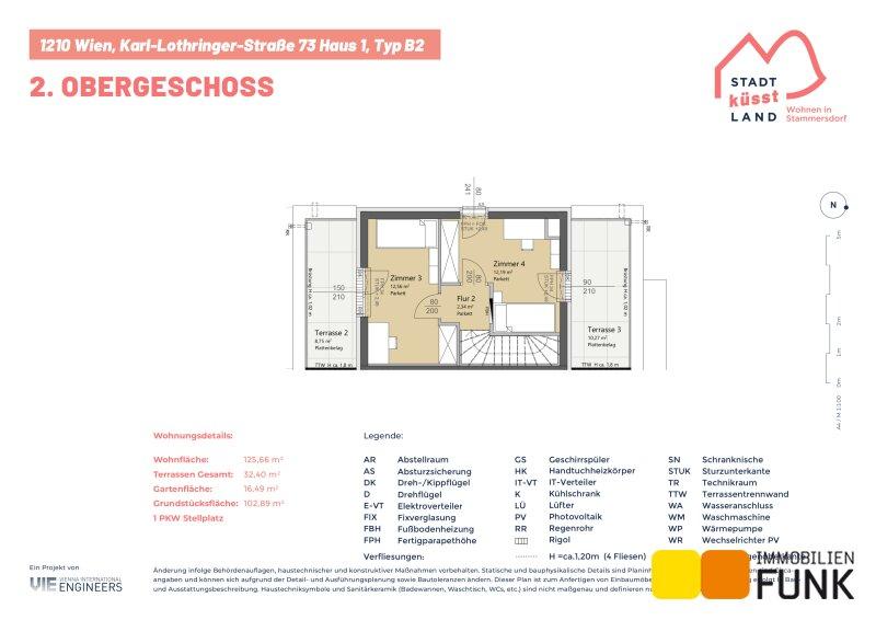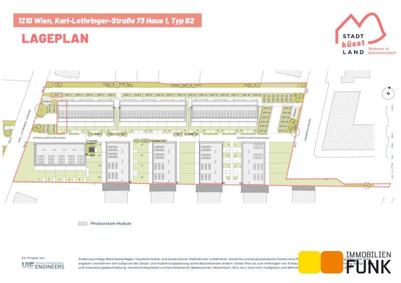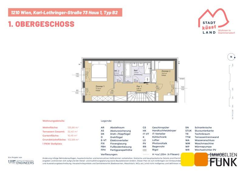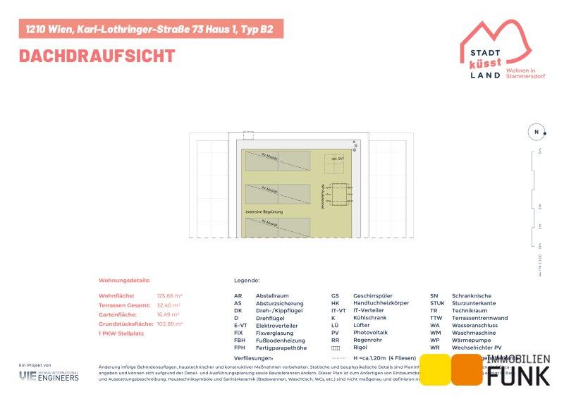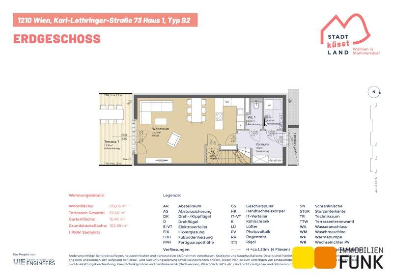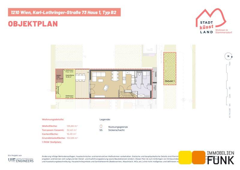 Das Reihenhaus 1 befindet sich in der Karl-Lothringer-Straße 73, 1210 Wien und wird auf einem ca. 102 m² großen Eigengrund errichtet. Seinen künftigen Bewohnern bietet es zudem eine komfortable Wohnfläche im Ausmaß von insgesamt ca. 125 m², angeordnet auf drei Geschoßen mit 5 Zimmern, 2 Toiletten, einem großen Badezimmer, dem Technikraum und einem Abstellraum, sowie einer südseitig ausgerichteten Terrasse mit ca. 13 m², die sich zu einem gemütlichen Gartenbereich mit ca. 16 m² öffnet. Im Dachgeschoß befinden sich zudem zwei Dachterrassen mit ca. 10 m² und 8 m². Diesem Reihenhaus ist ein Parkplatz direkt vor der Haustüre zugewiesen. Der Kaufpreis für den KFZ-Platz beträgt 19.000,00 € .